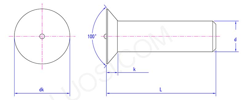 یک سر ناودانی های سر صاف 100 درجه یک سر صاف 100 درجه است، در حالی که انتهای دیگر دارای رزوه است. سر صاف آن را قادر می سازد تا محکم با اجزایی که دارای سوراخ های غرق شده مربوطه هستند قرار گیرد. مشخصات نخ آن بسیار زیاد است، از اندازه کوچک M3 تا اندازه بزرگتر M16.