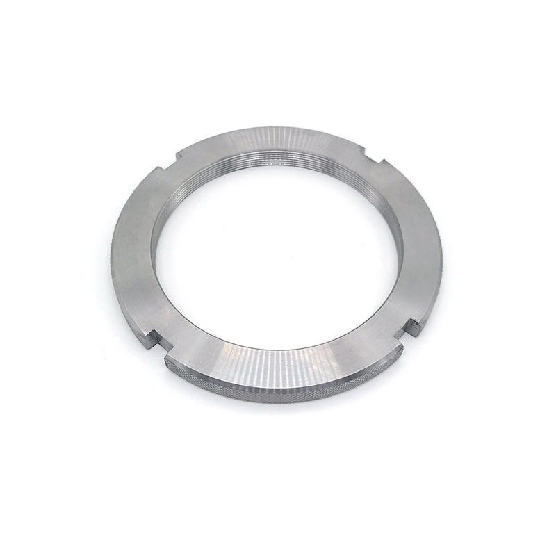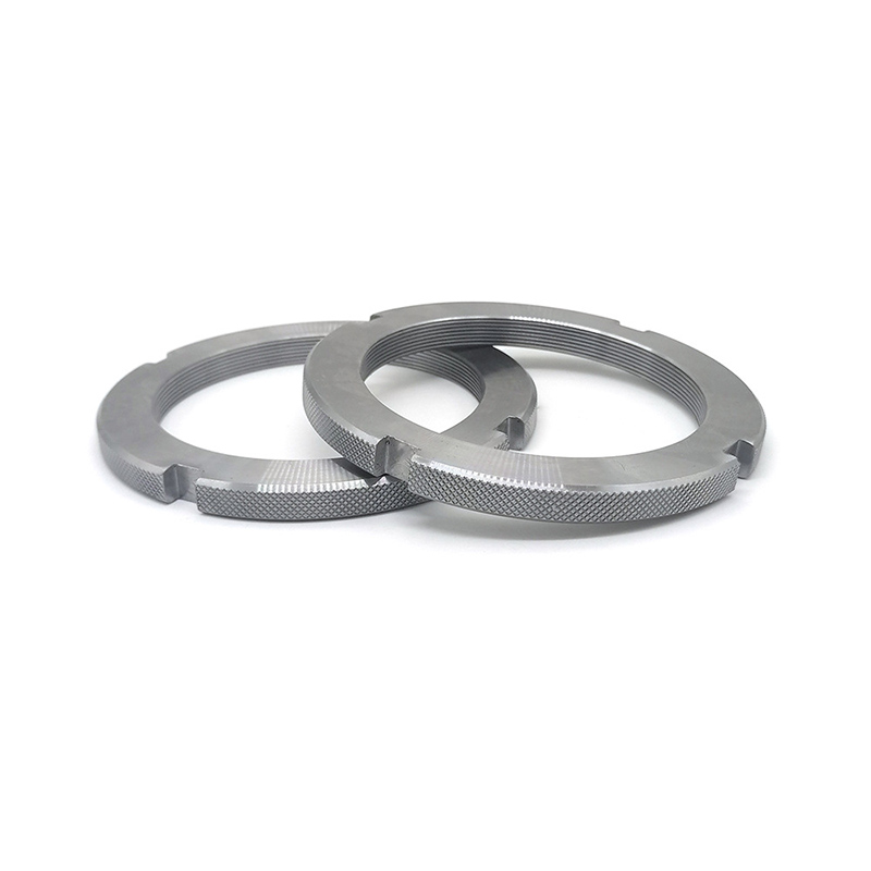 مهره های گرد شکاف دار کاملاً رزوه ای - طبق استانداردهایی مانند DIN 546 تعریف شده اند و عمدتاً برای دستیابی به اتصال ایمن استفاده می شوند و می توانند لرزش ها را تحمل کنند. ویژگی اصلی این مهره ها در شکاف های بریده شده در یک انتهای مهره نهفته است. نحوه استفاده از آنها به این صورت است: ابتدا مهره را روی یک پیچ یا گل میخ از قبل سوراخ شده پیچ کنید و آن را در موقعیت مورد نظر سفت کنید. پس از سفت کردن، شیار را با سوراخ روی محور پیچ تراز کنید. در نهایت، یک پین باز (واشر قفل) یا خط ایمنی را از طریق شکاف و سوراخ پیچ و مهره تراز شده وارد کنید و سپس انتهای پین را خم کنید تا مطمئن شوید که مناسب است. بنابراین، در صورت وجود ارتعاش، مهره شل نمی شود.